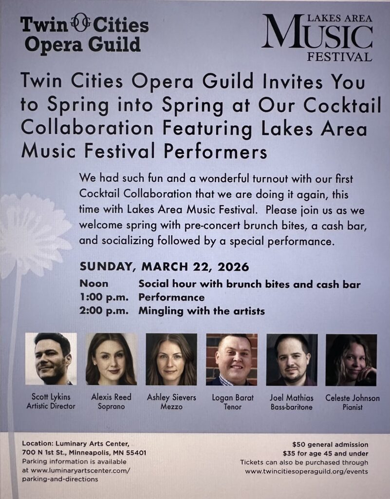 Join Twin Cities Opera Guild and Lakes Area Music Festival performers at a midday cocktail collaboration that celebrates spring with a social hour of brunch bites and beverages, an hour performance, and mingling after.